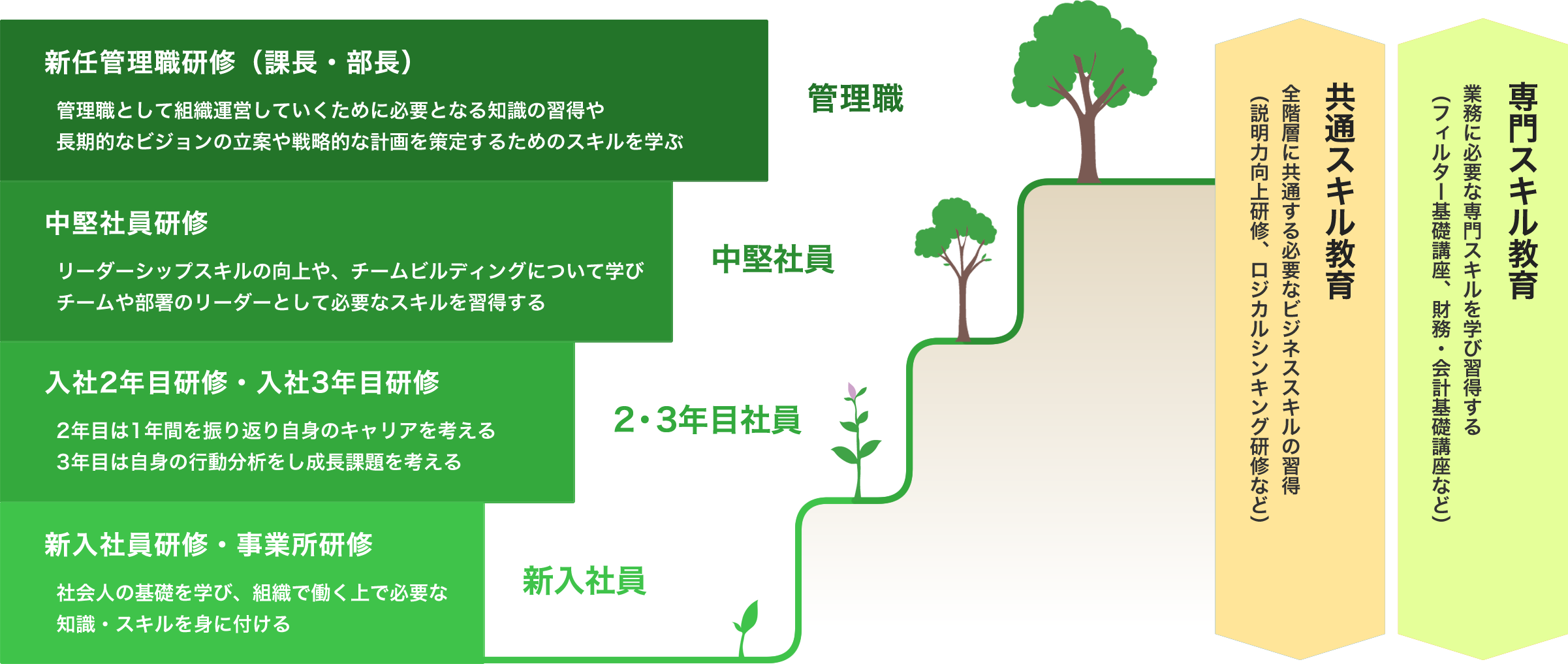 スマイルカレッジでは、新入社員、若手・中堅社員、管理職を対象とした「階層別研修」、社員が共通で必要なビジネススキルを習得する「共通スキル教育」、職種や役割に応じて必要な専門スキルを習得する「専門スキル教育」があります。