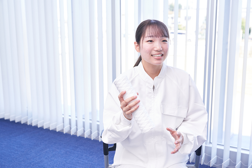 小中学校ではバスケット、高校ではダンス部と、スポーツに打ち込む。ロキテクノは高校の先生の紹介で知り、会社説明会等で会った社員の人柄や雰囲気の良さに惹かれて入社。現在はフィルター製造工程の中でも接着などの二次加工をメインに担当するほか、幅広い製造業務に知見を広げている。またロキテクノが運営する社会人野球チームの応援団にも所属し、仕事にプライベートにと充実した日々を送っている。