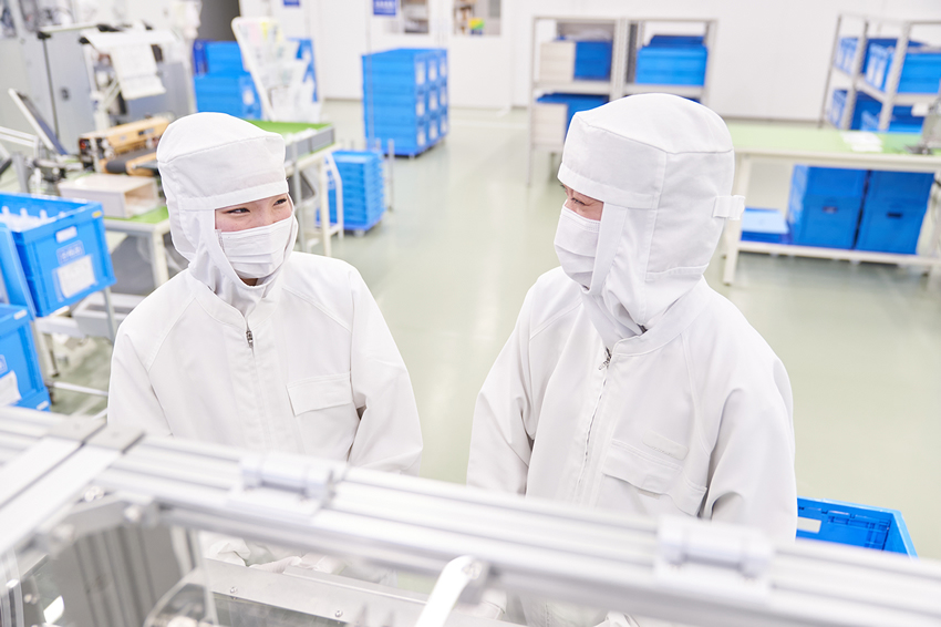 幅広い製造ラインに対応。入社後は3ヶ月間の研修で製造業務を学び、研修で学んだ内容のプレゼンテーションを行いました。現場に配属となってからは、ろ過フィルターの本体ユニットの生産、接着、カプセル化の二次加工、検査、梱包といった一連の流れを経験しました。